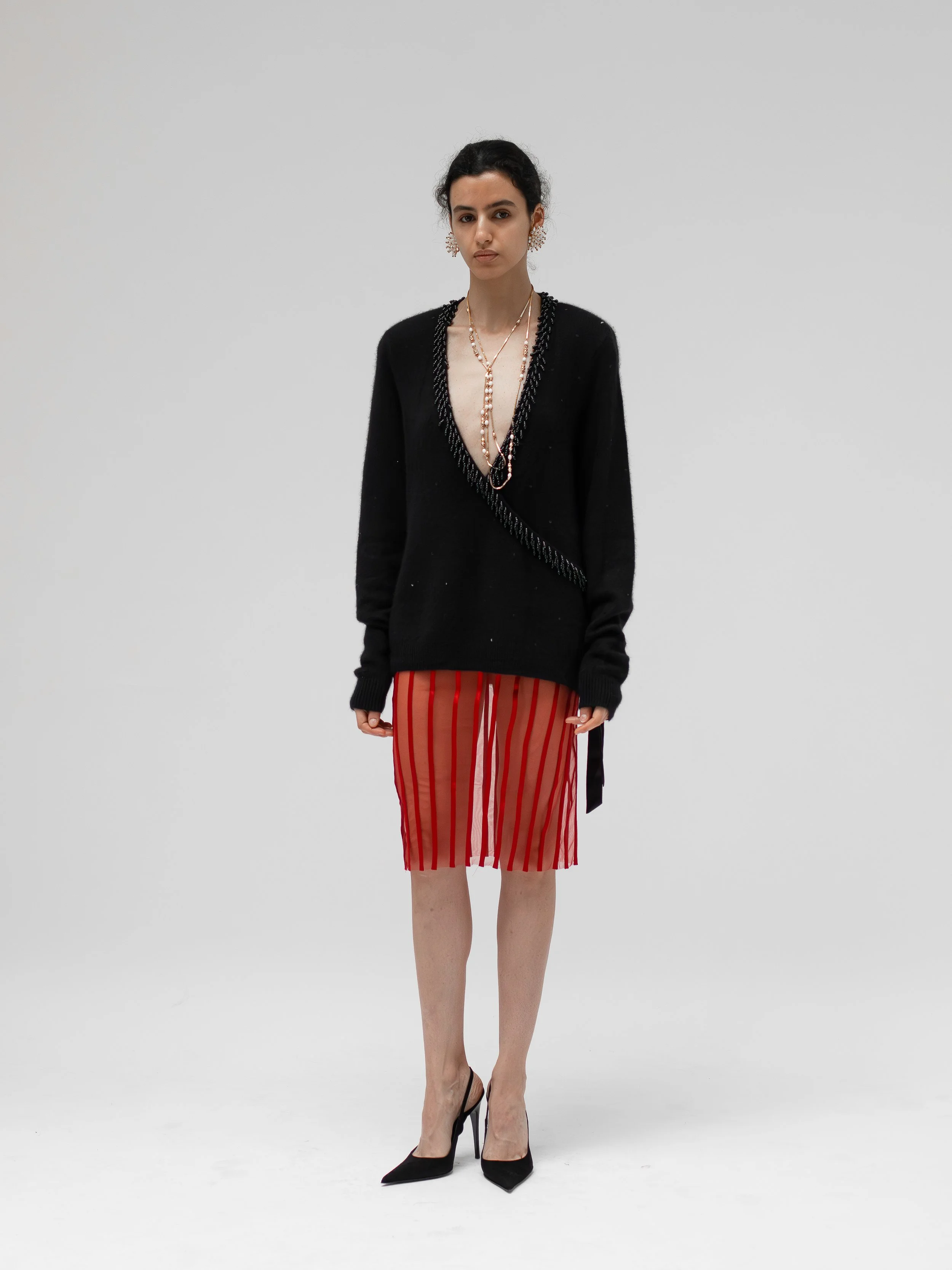 Model is 174 cm, size XS. Her measurements are: breast 79 cm, waist 62 cm, hips 87 cm.
