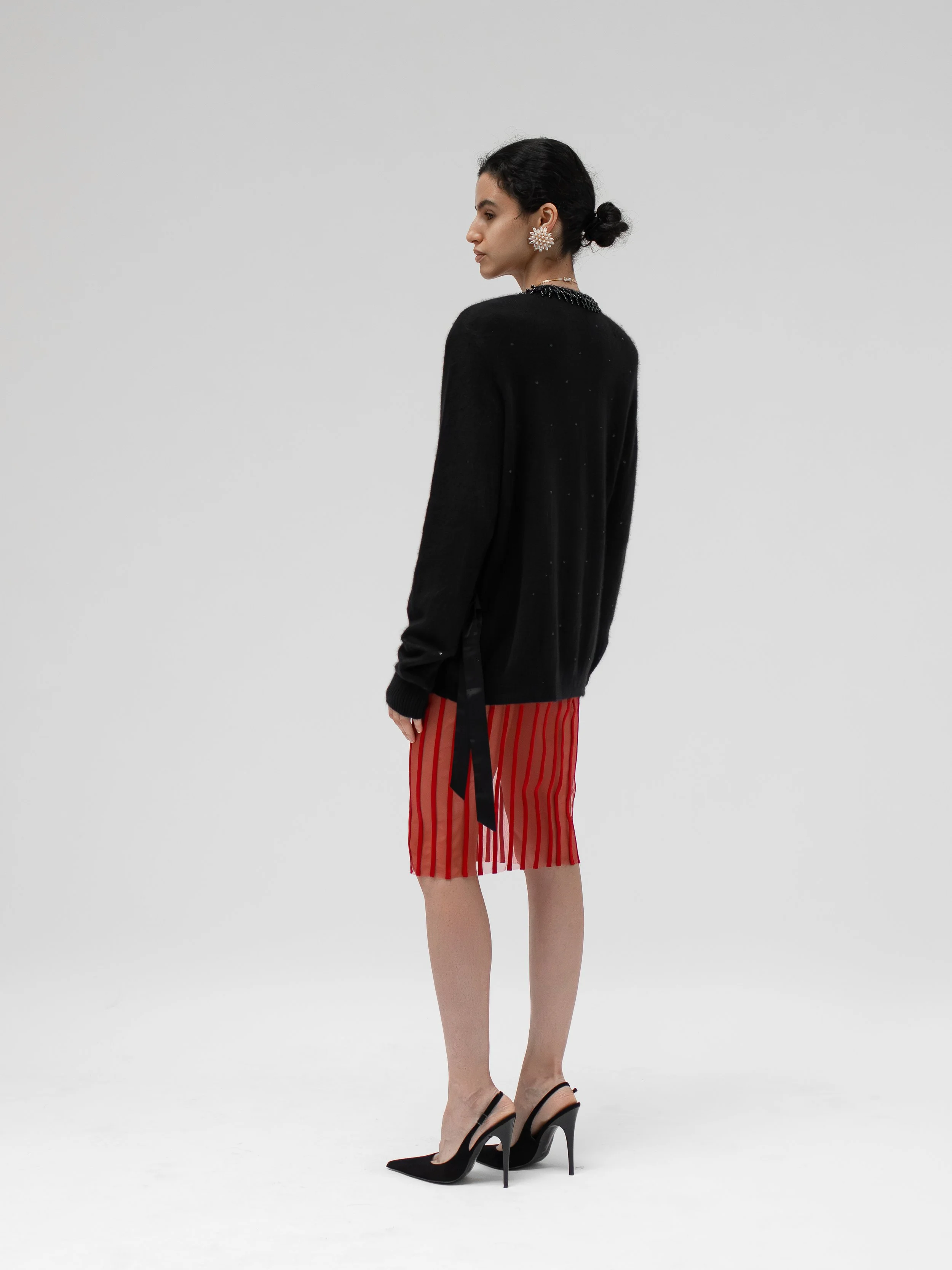 RICHMOND knee length skirt crafted from soft fine wool in black with cut out all over ensuring an elegant line. Mid-rise.