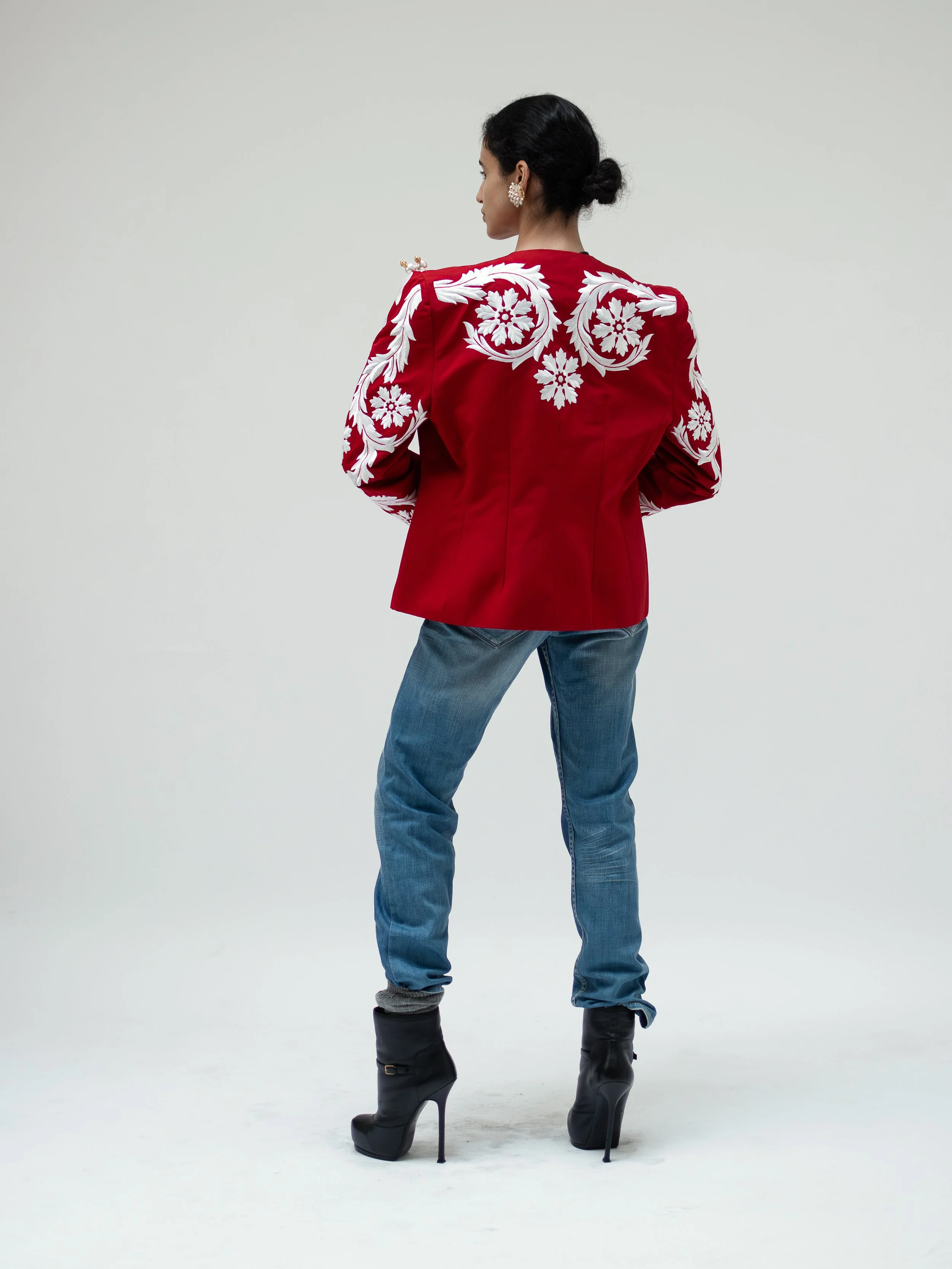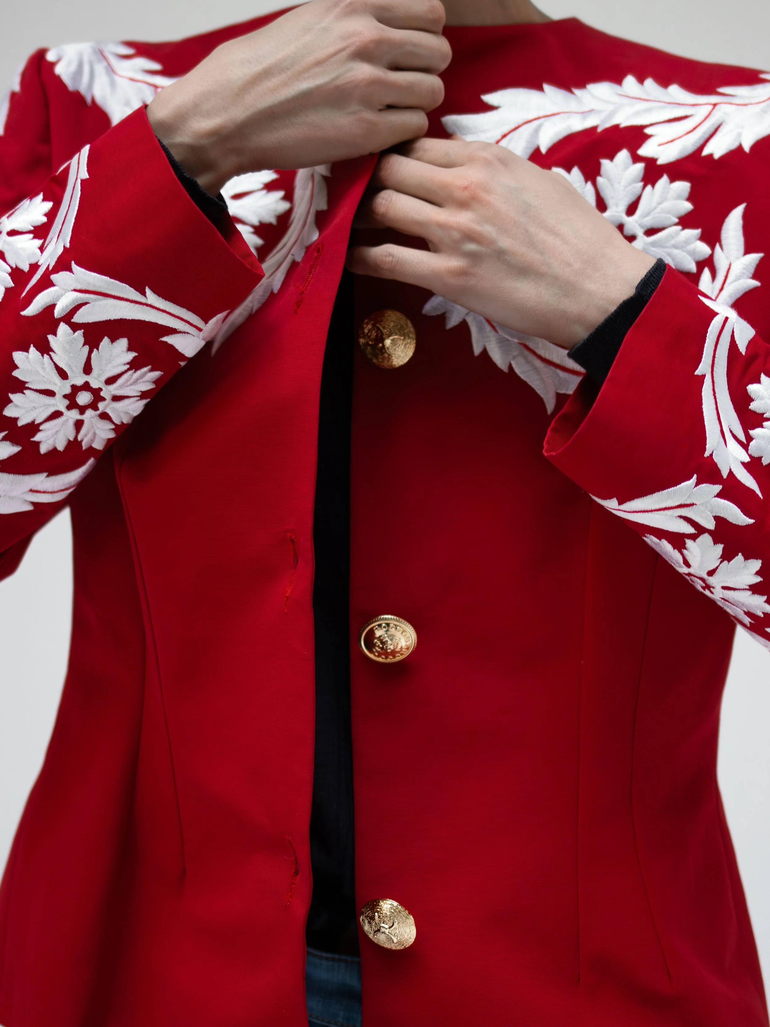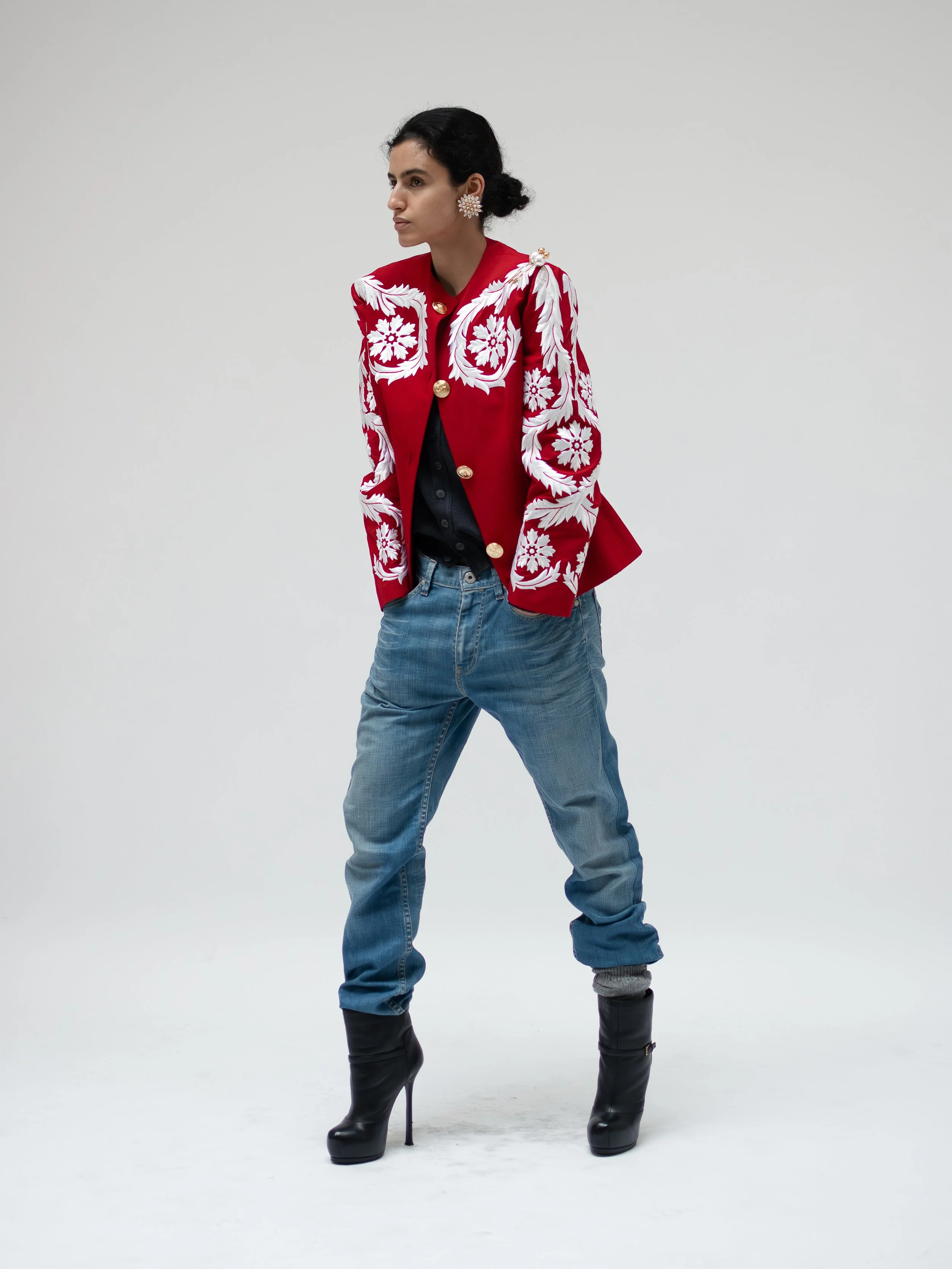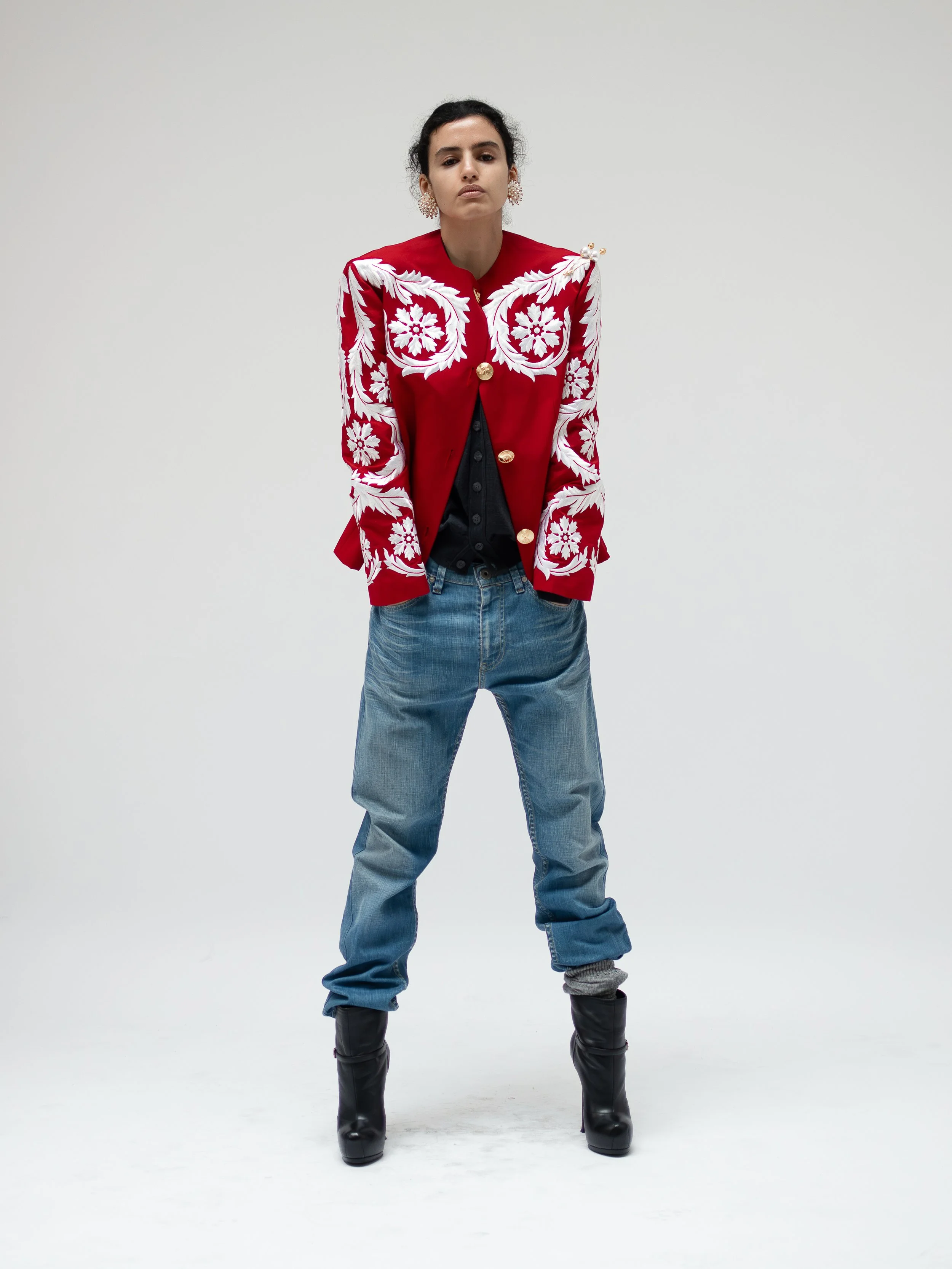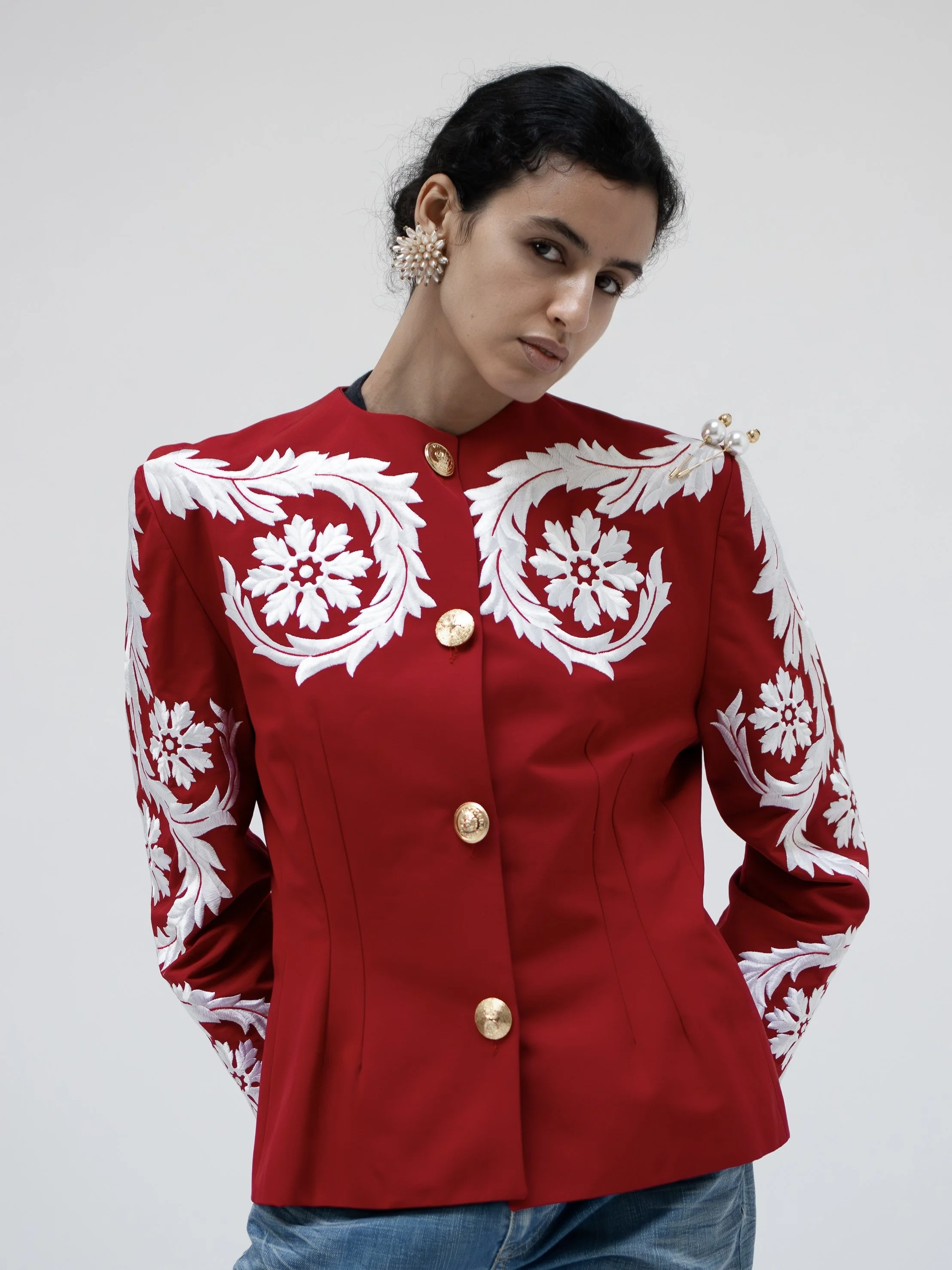 Precious vintage blazer crafted from pure wool, embellished by contrasting black & gold embroideries and golden tone buttons. Waisted cut, oblique pockets. A timeless classic kind of garment that I personally love.