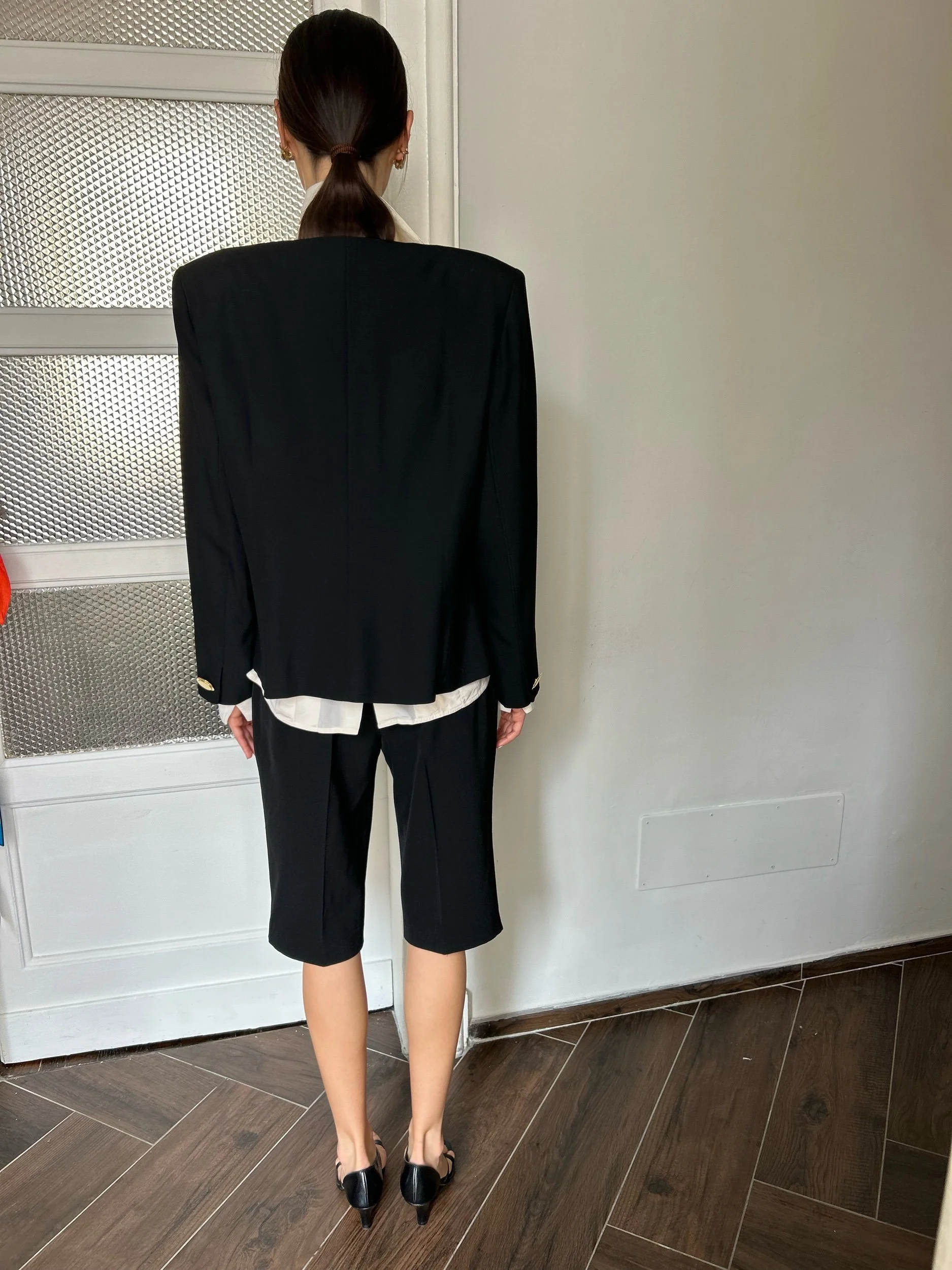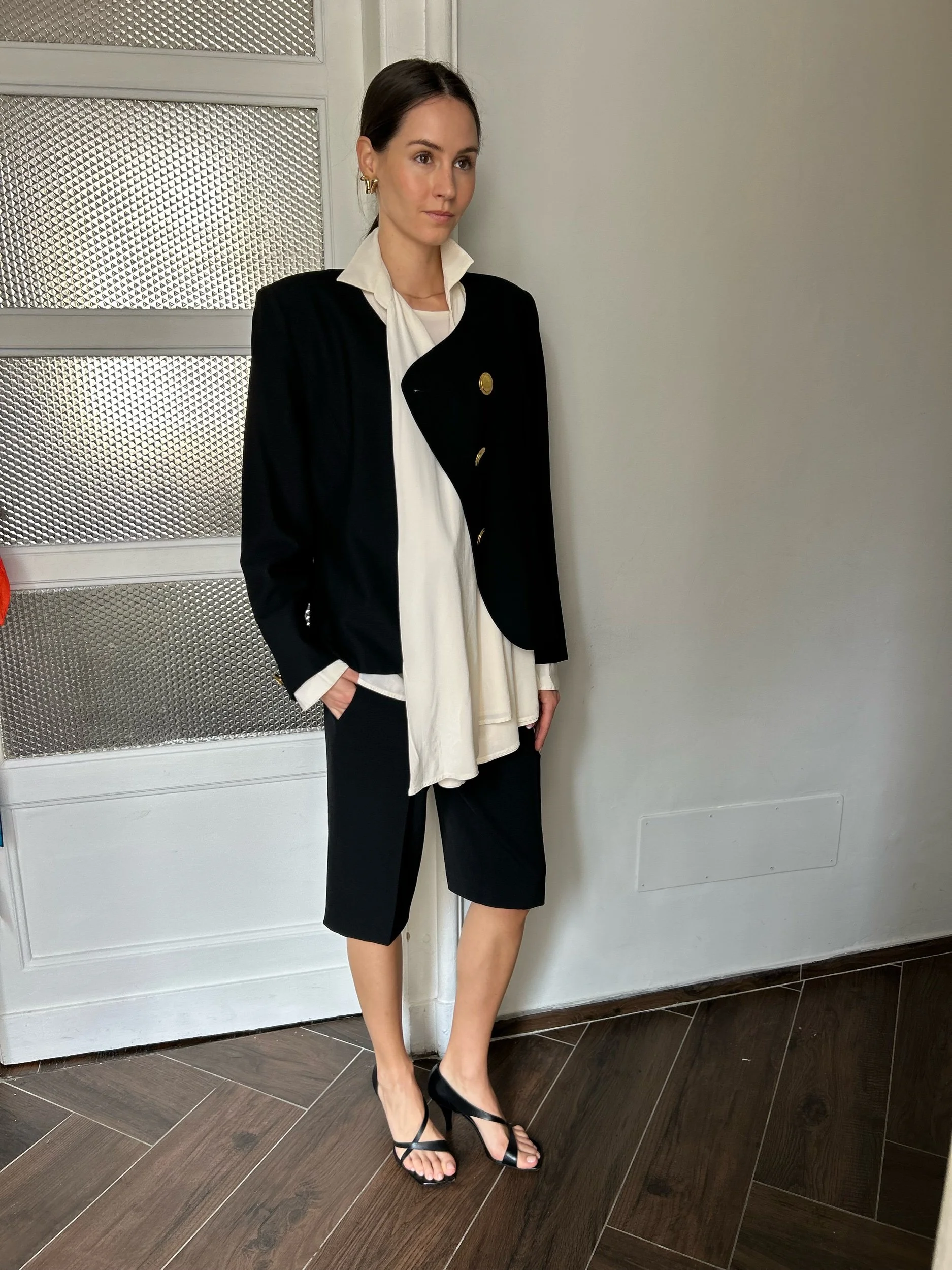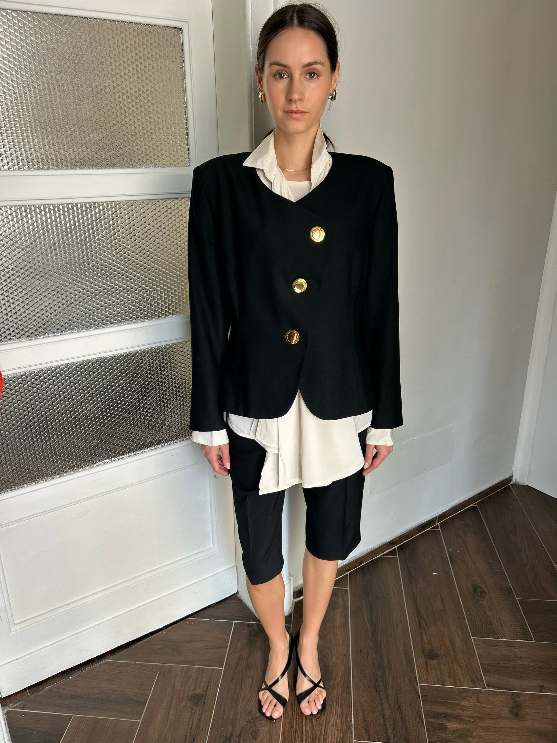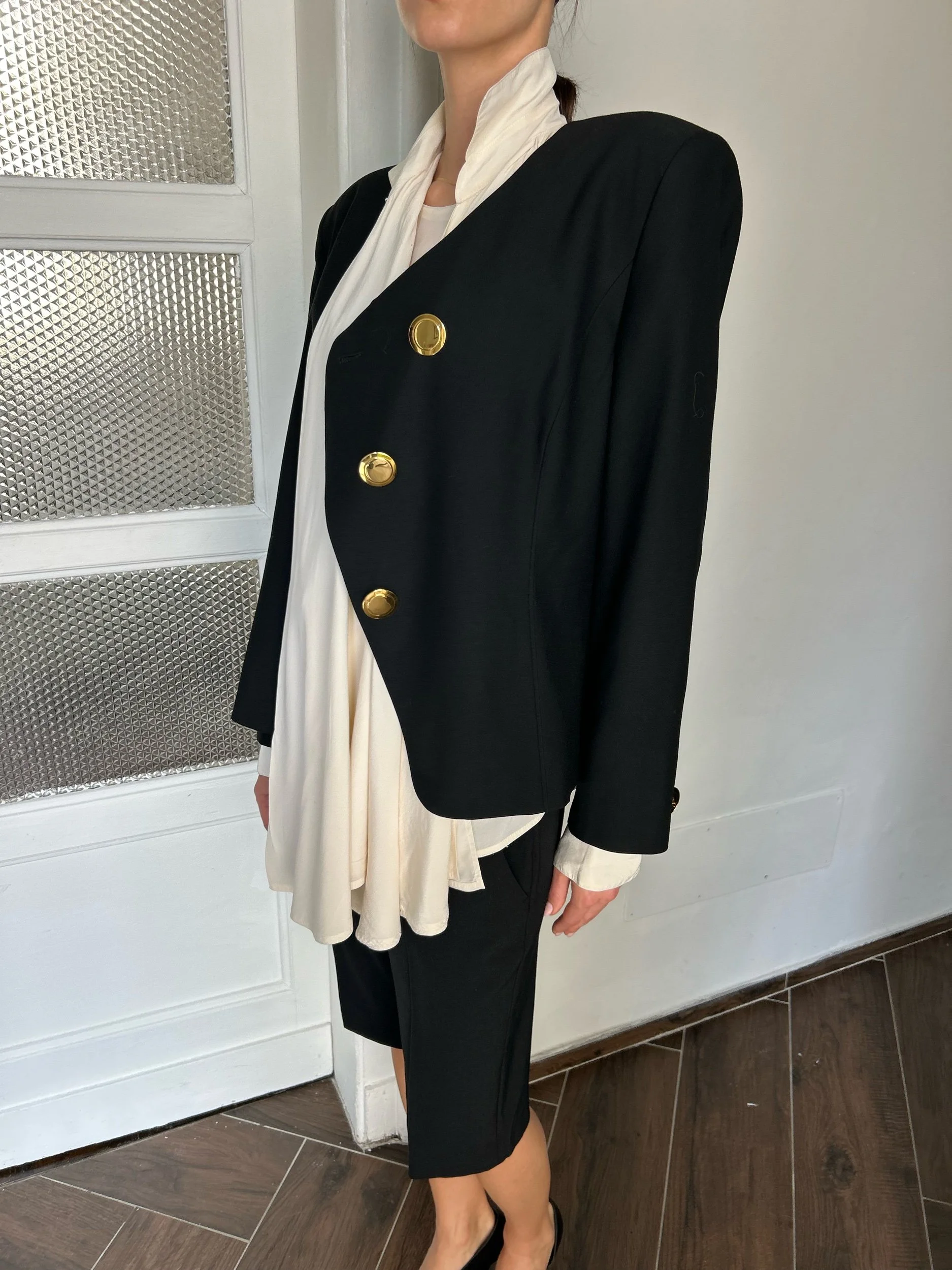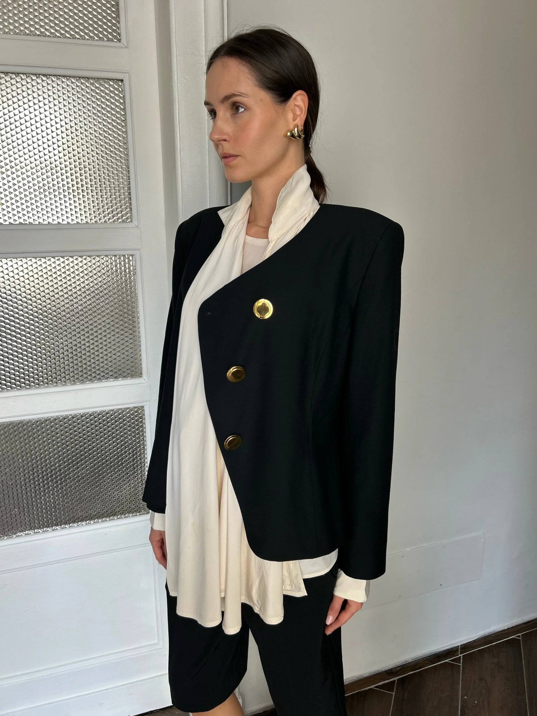 Black wool double-breasted blazer featuring oversized gold buttons and a rounded neckline. Finished with padded shoulders.